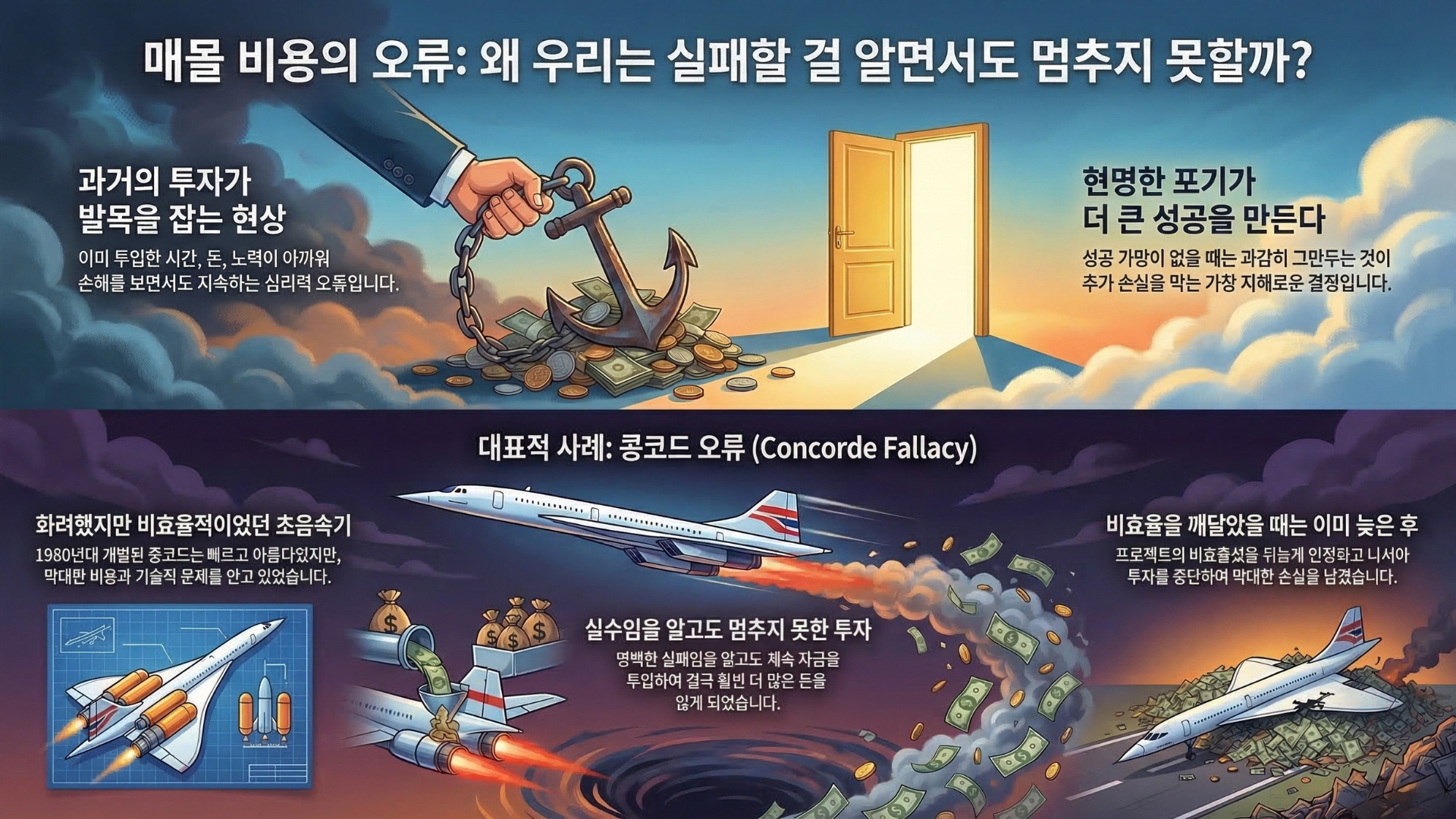 그런데도 두 나라는 계속 만들었어요. “여기서 멈추면 지금까지 쏟아부은 게 다 날아가잖아.” 결국 2003년에야 조용히 퇴역했어요. 이후 경제학자들은 이 심리에 이름을 붙였어요. 콩코드 오류(Concorde fallacy).